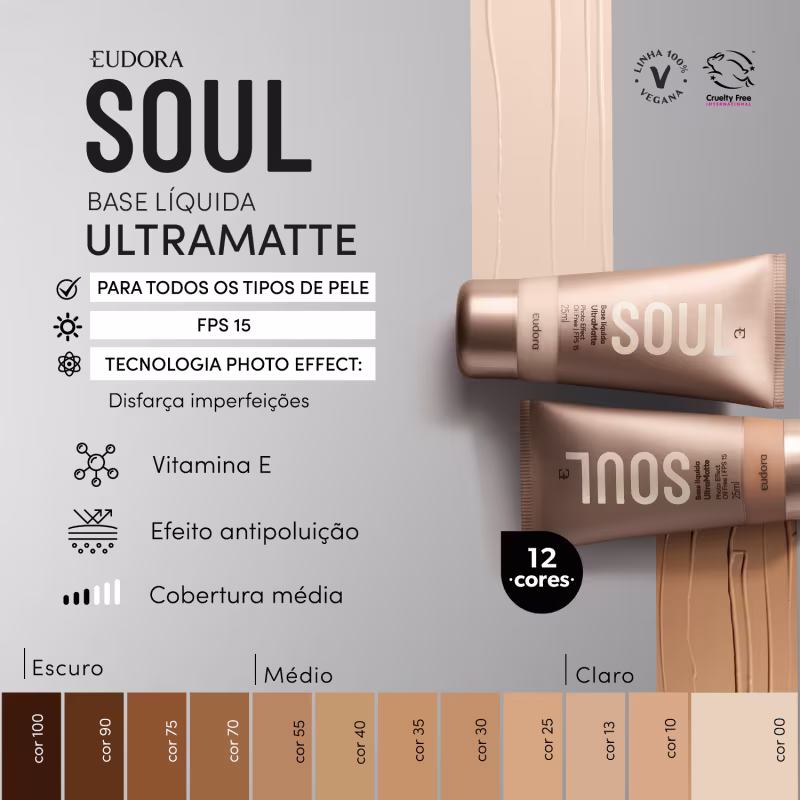 A Base Líquida Soul Ultra Matte conta com vitamina E que hidratada e pele, efeito antipoluição e FPS 15. Confira! Entrega rápida. Ver mais ❯