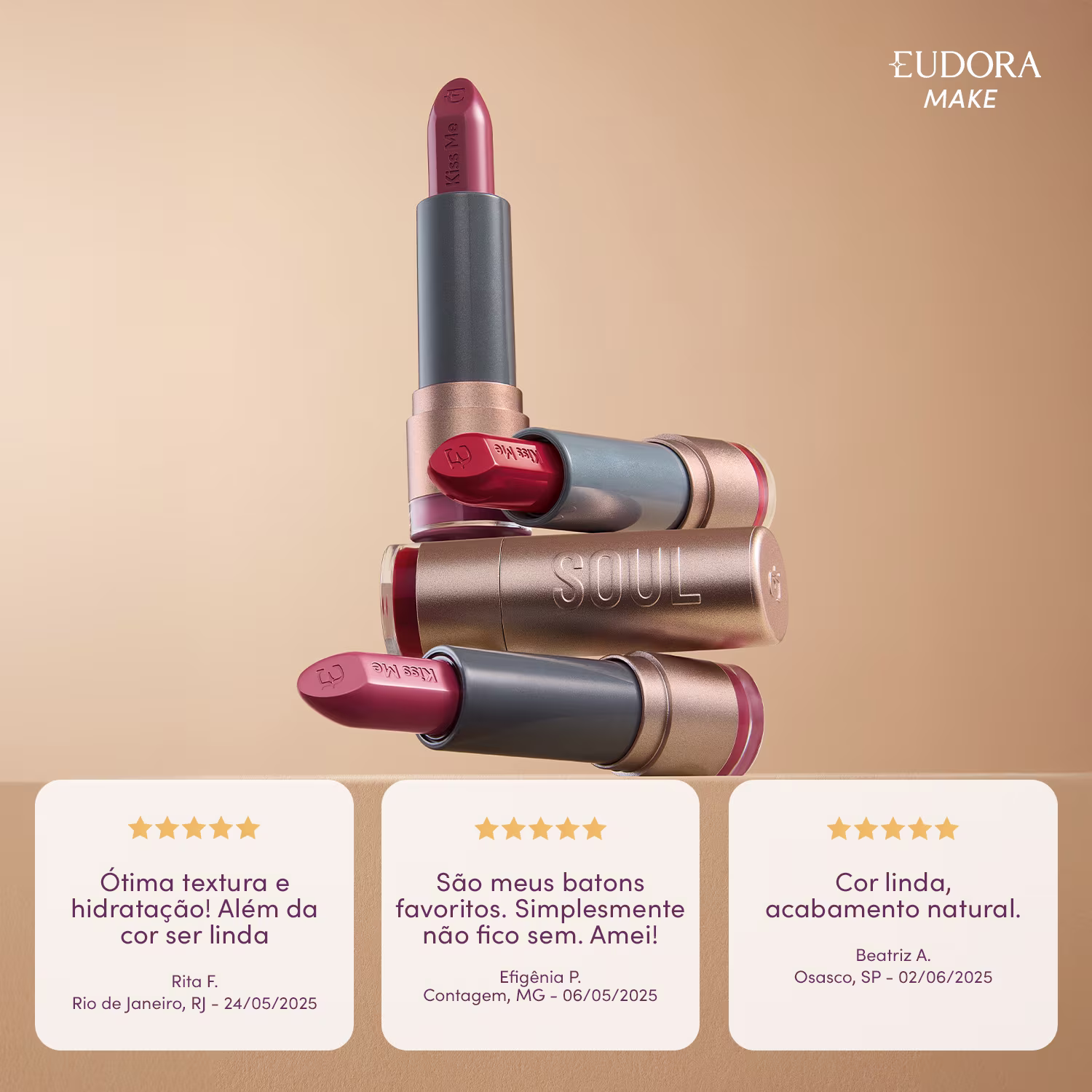 Soul Kiss Me Hidratante é a evolução do batom com tratamento com textura hidragel e visor na cor escolhida. Ver mais ❯