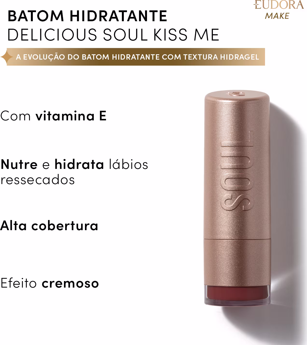 Em um novo tom com fragrância inspirada no chocolate, o Batom Hidratante Marrom Delicious SOUL Kiss Me traz a evolução do batom hidratante com com uma cor glamourosa que é tendência da moda!