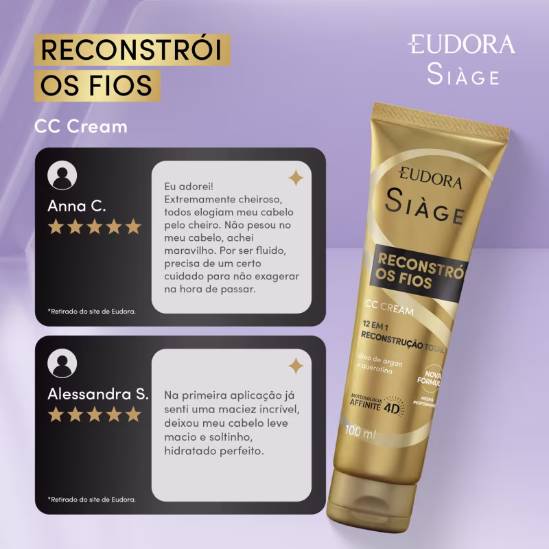 Eudora Siàge uniu a força da natureza ao poder da ciência e criou a exclusiva biotecnologia Affinité 4D. Com inteligência detectora de danos, trata os fios até a camada mais profunda, mesmo após o enxágue. A linha Siàge Reconstrói os Fios conta com uma gama completa de produtos que entregam 6x mais força, combate as pontas duplas e quebradas e recupera 1 ano de danos em apenas duas semanas de tratamento.