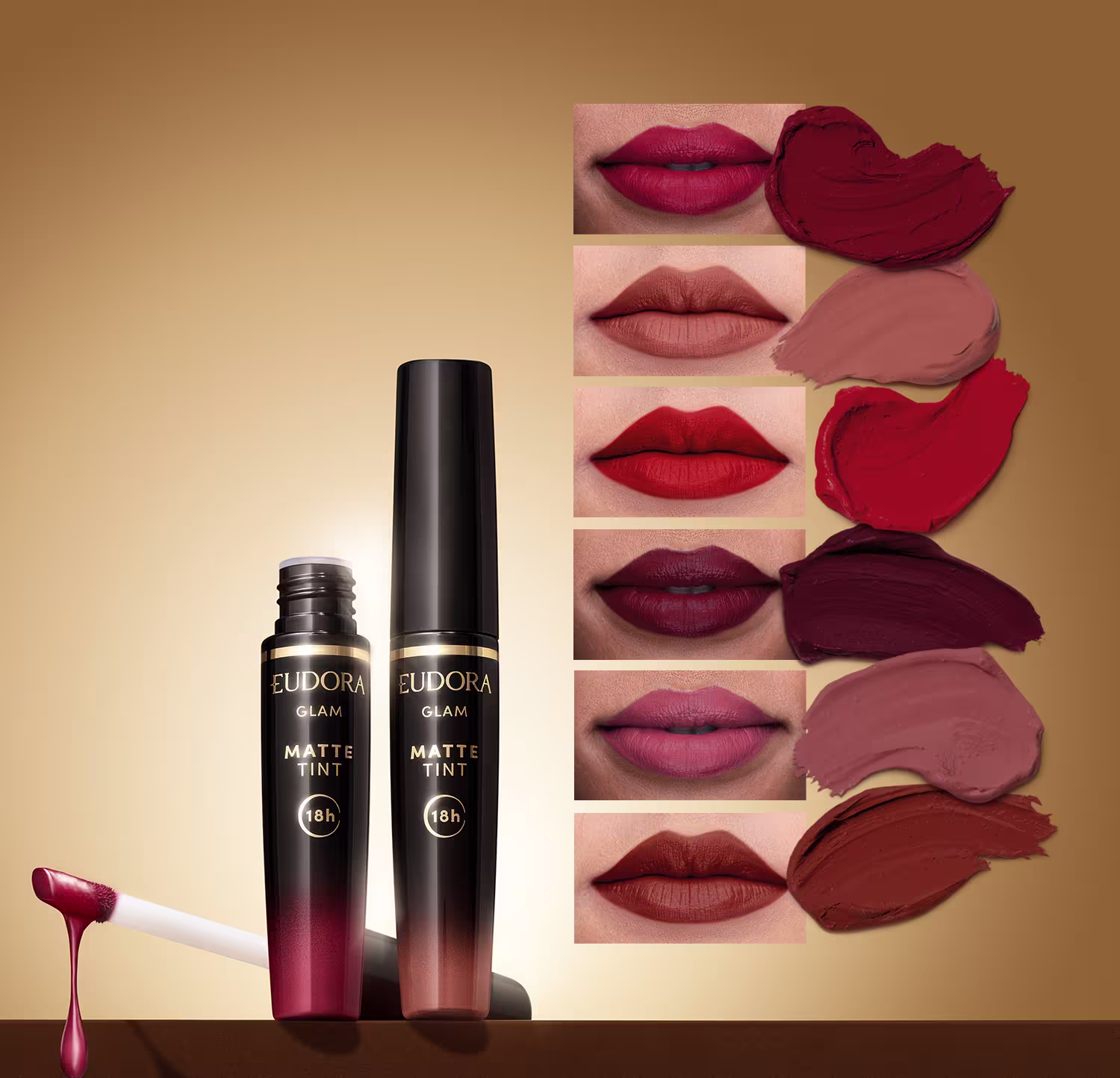 O batom líquido Eudora mais querido agora está com ativos de tratamento! Para que você tenha a coleção completa no seu kit maquiagem, trazemos o Combo Glam Matte Tint, com os seis batons glamourosos da linha.