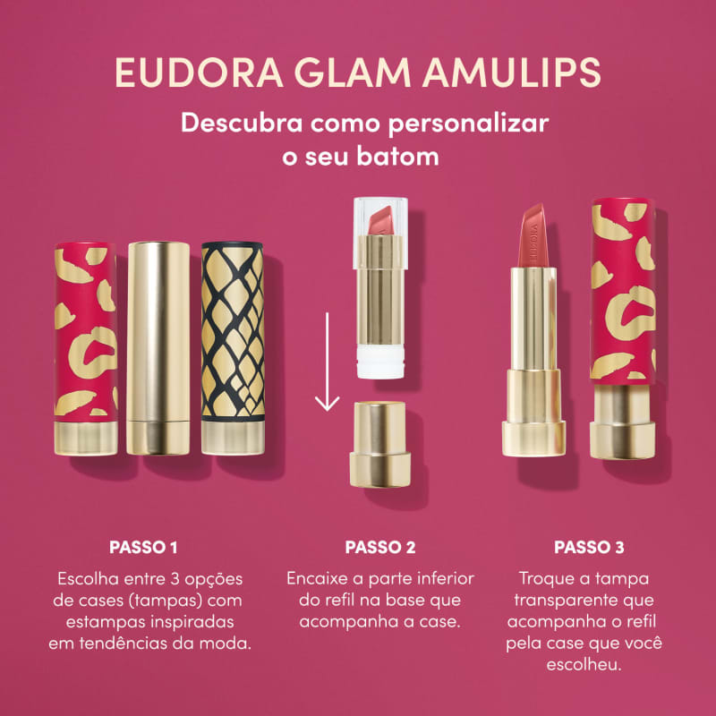 Apresentamos o Eudora Glam Batom Customizável Amulips, seu novo amuleto para uma autoconfiança poderosa. Com ele, você conquista uma make glamourosa e sofisticada em apenas 5 minutos, com resultados comprovados por neurociência!