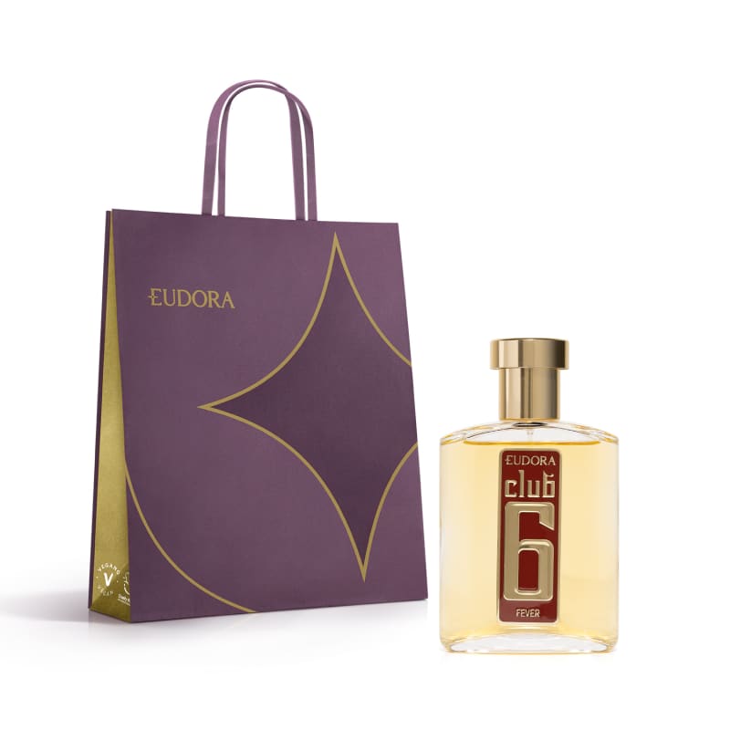 Surpreenda-se com este combo especial! A fragrância masculina envolvente do Club 6 Fever, com notas de gengibre, âmbar, um toque exclusivo de tequila e fundo amadeirado acompanha uma elegante sacola Eudora para presentear com muito estilo em qualquer ocasião especial.
