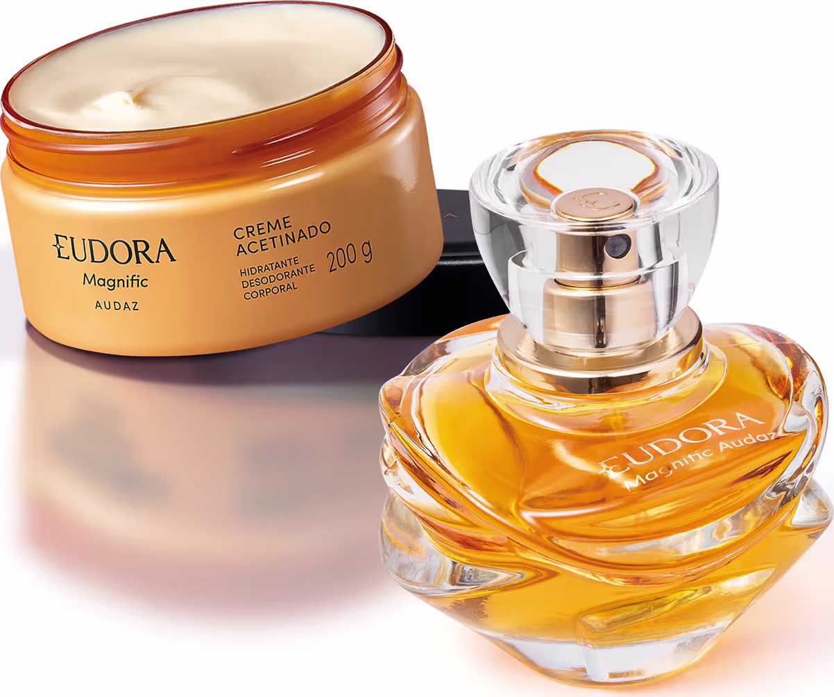 O Combo Eudora Magnific Audaz entrega um Eau de Parfum e um Creme Acetinado Corporal para envolver seu corpo com hidratação intensa e uma fragrância cheia de feminilidade e força, afinal, sua coragem te faz magnífica.