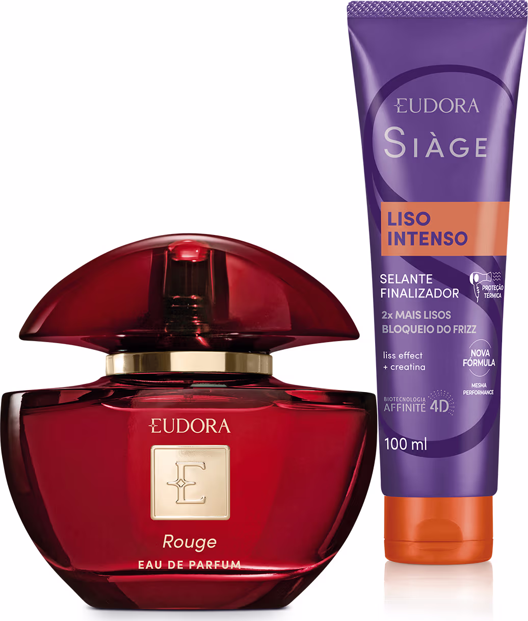 O combo une a fragrância feminina Chypre Floral Eudora Rouge Eau de Parfum e o tratamento capilar Leave-In Capilar Selante Finalizador Siàge Liso Intenso. A vantagem é conquistar um visual completo: cabelos alinhados e sem frizz com uma perfumação marcante, inspirada no poder do vermelho e nas notas de Maçã Vermelha.