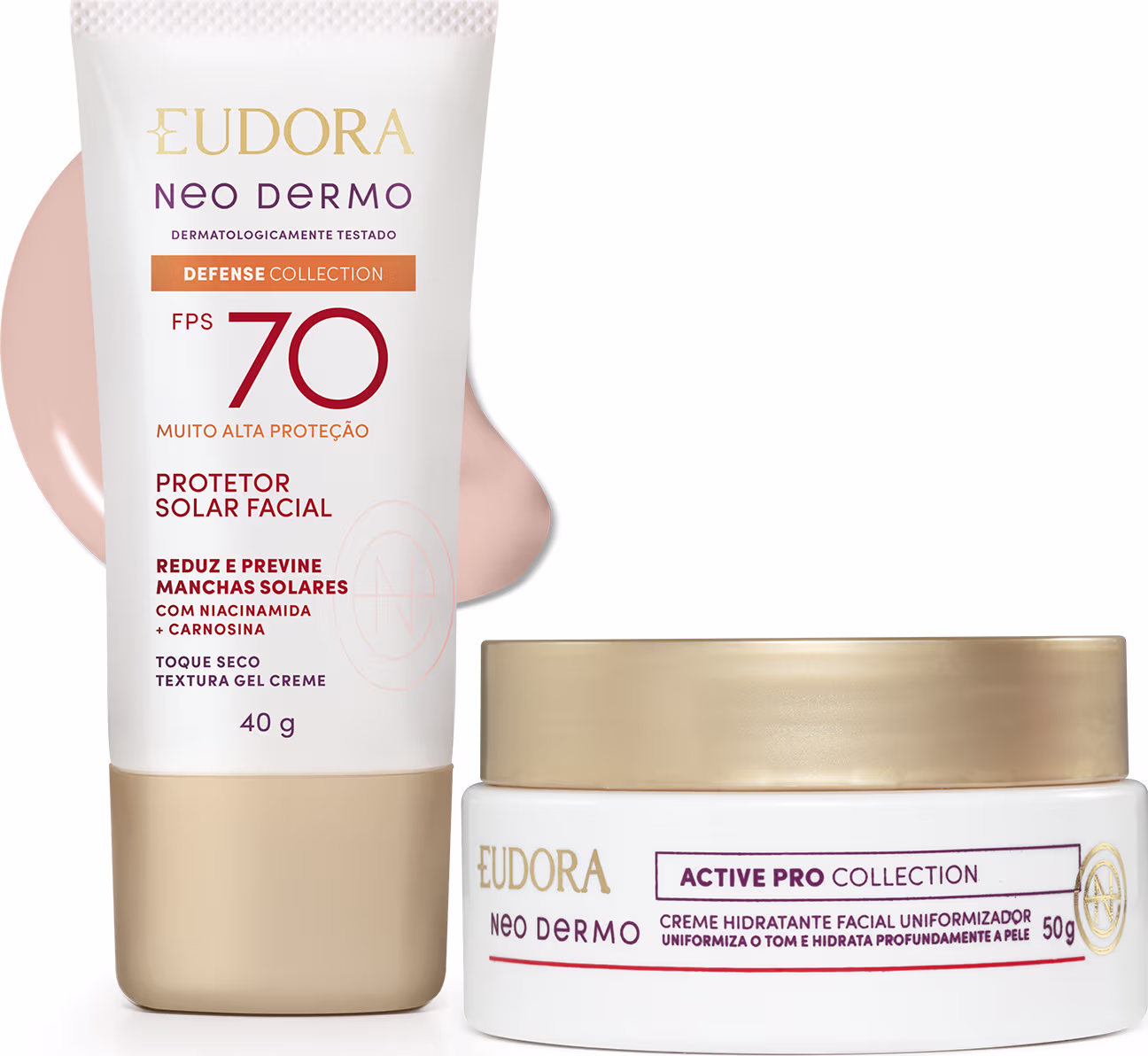 Este combo Neo Dermo oferece a rotina diária perfeita de cuidado facial combinando tratamento e proteção. O Creme Uniformizador trata irregularidades no tom da pele em 4 semanas, e o Protetor Solar FPS 70 com cor oferece alta proteção e toque seco. Utilize a dupla para uma pele visivelmente mais uniforme e protegida contra manchas solares e sinais de envelhecimento.