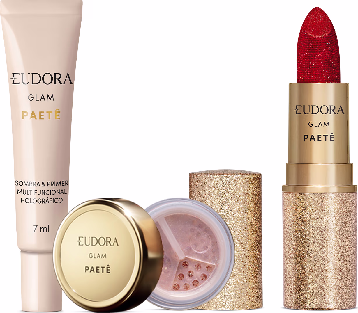 Combo Glam Paetê: Glitter Multifuncional Rosê 1g + Sombra & Primer 7ml + Batom Cremoso Vermelho 3g