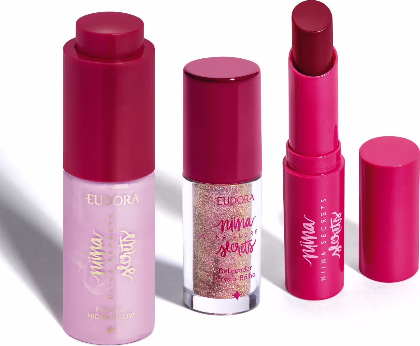 O trio Niina Secrets essencial: primer com glow, hidratação profunda para lábios e olhar iluminado. Ver mais ❯