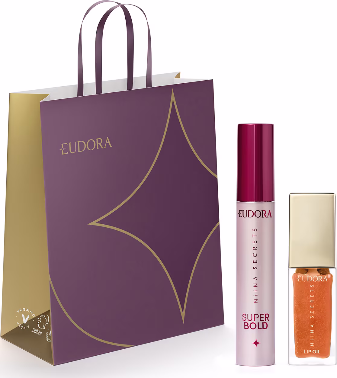 Combo Niina Secrets: Máscara de Cílios Super Bold 10g + Lip Oil Shine Flowers 7ml + Sacola de Presente P