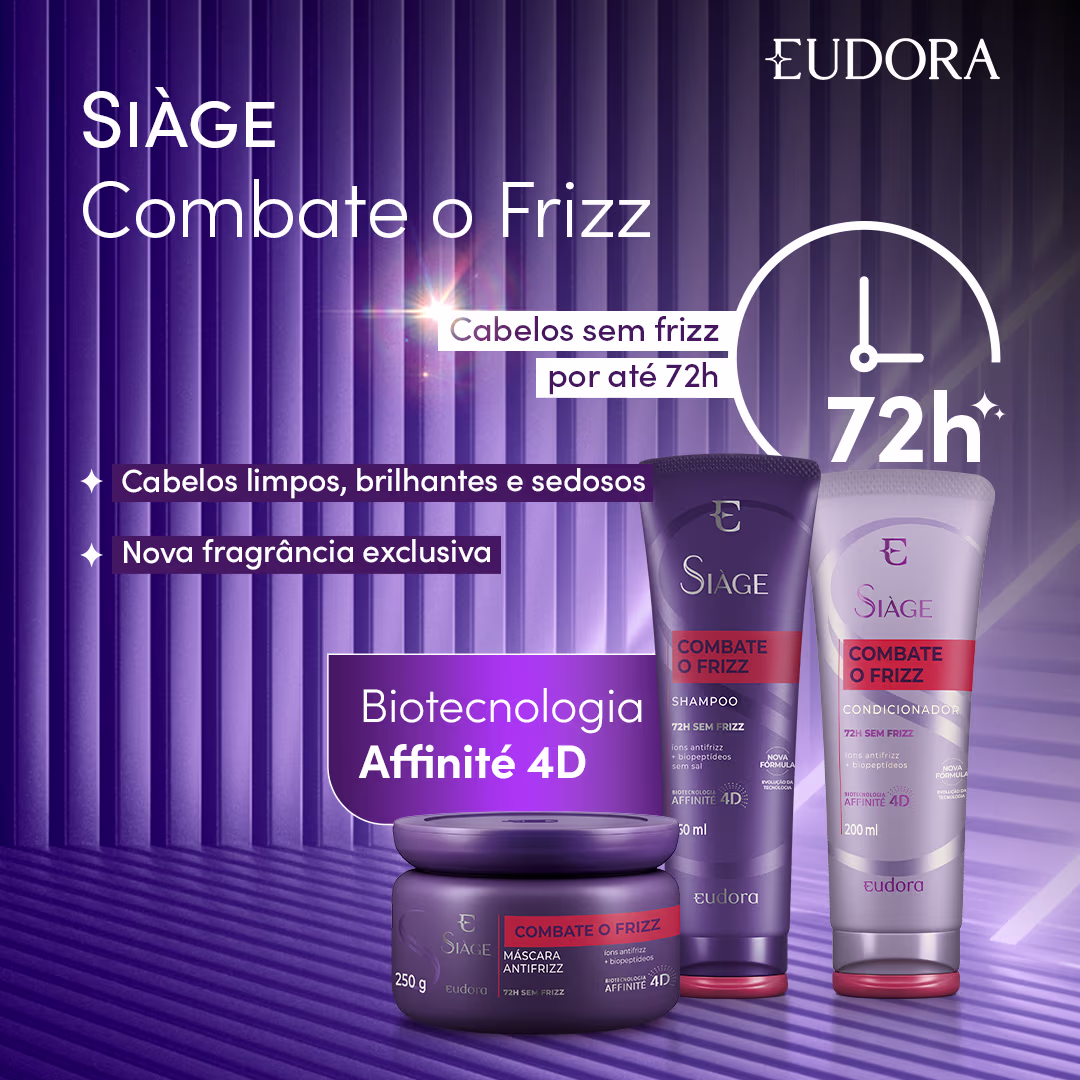 Com o Combo Siàge Combate o Frizz, você terá sempre à disposição os cosméticos ideais para garantir cabelos alinhados e disciplinados por até 72 horas. O shampoo limpa suavemente e prepara os cabelos para receber o tratamento antifrizz. O condicionador sela as cutículas capilares e hidrata profundamente.