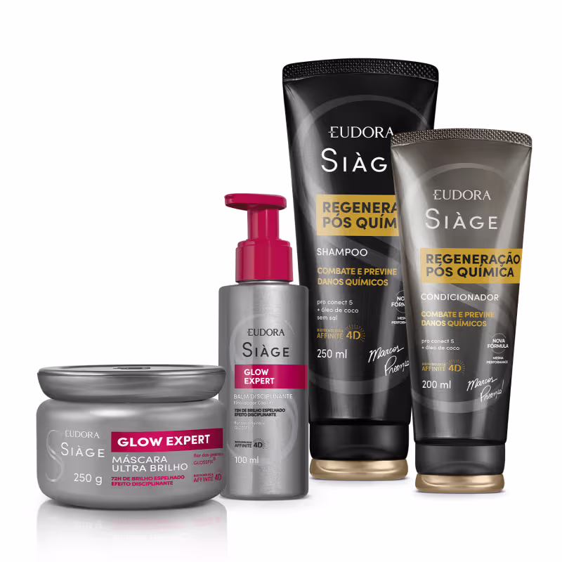 Restaure a beleza e a vitalidade dos seus fios. Combinando o poder regenerador de Siàge Regeneração Pós-Química com a expertise de Siàge Ultra Glow Expert, este combo oferece tratamento completo para cabelos quimicamente tratados e opacos. Da raiz às pontas, seus cabelos recuperados, ultra macios, brilhantes e protegidos.