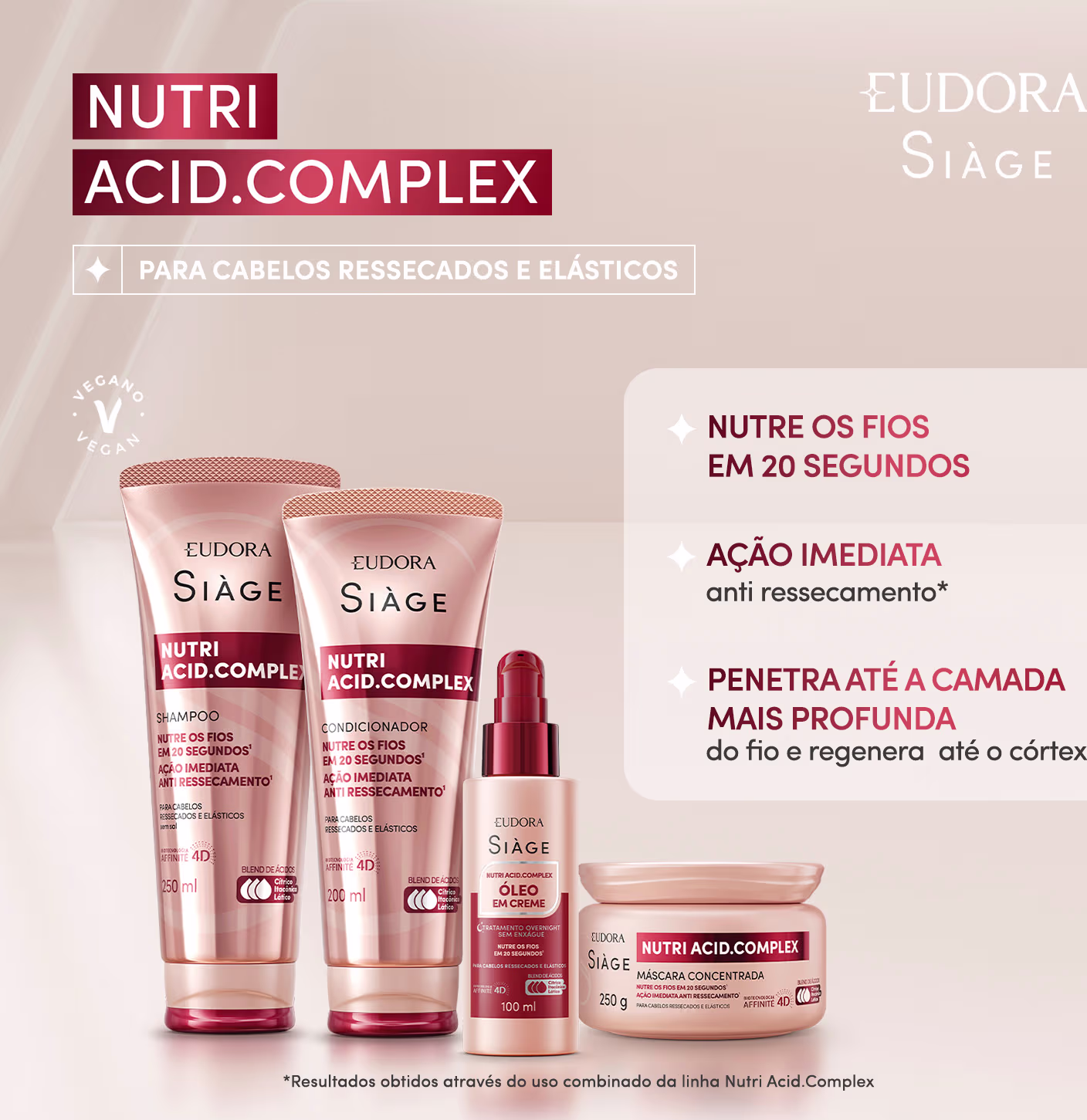 Este Combo Siàge Nutri Acid.Complex oferece uma rotina completa de tratamento para cabelos ressecados e elásticos. Reúne a linha completa: Shampoo, Condicionador, Máscara Concentrada, e Óleo em Creme, proporcionando nutrição profunda e reparação em todas as camadas do fio.