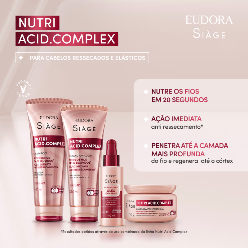 O Condicionador Siàge Nutri Acid.Complex desembaraça e sela as cutículas, proporcionando uma dose poderosa de nutrição para a fibra capilar. Promove fios com mais maciez e movimento. Sua fórmula contém ácidos e óleos para hidratação e selamento.