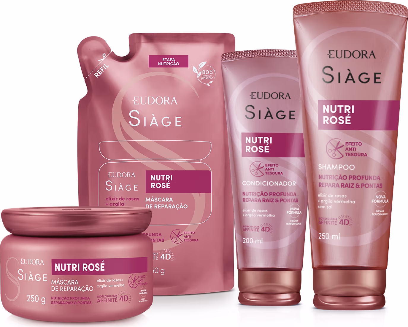 O Combo Siàge Nutri Rosé é ótimo para ser o cuidado nutritivo do seu cronograma capilar. Conta com ativos que agem imediatamente nos fios com profundidade para devolver seu aspecto saudável. E ainda traz opção em refil para mais sustentabilidade no tratamento capilar. Confira: