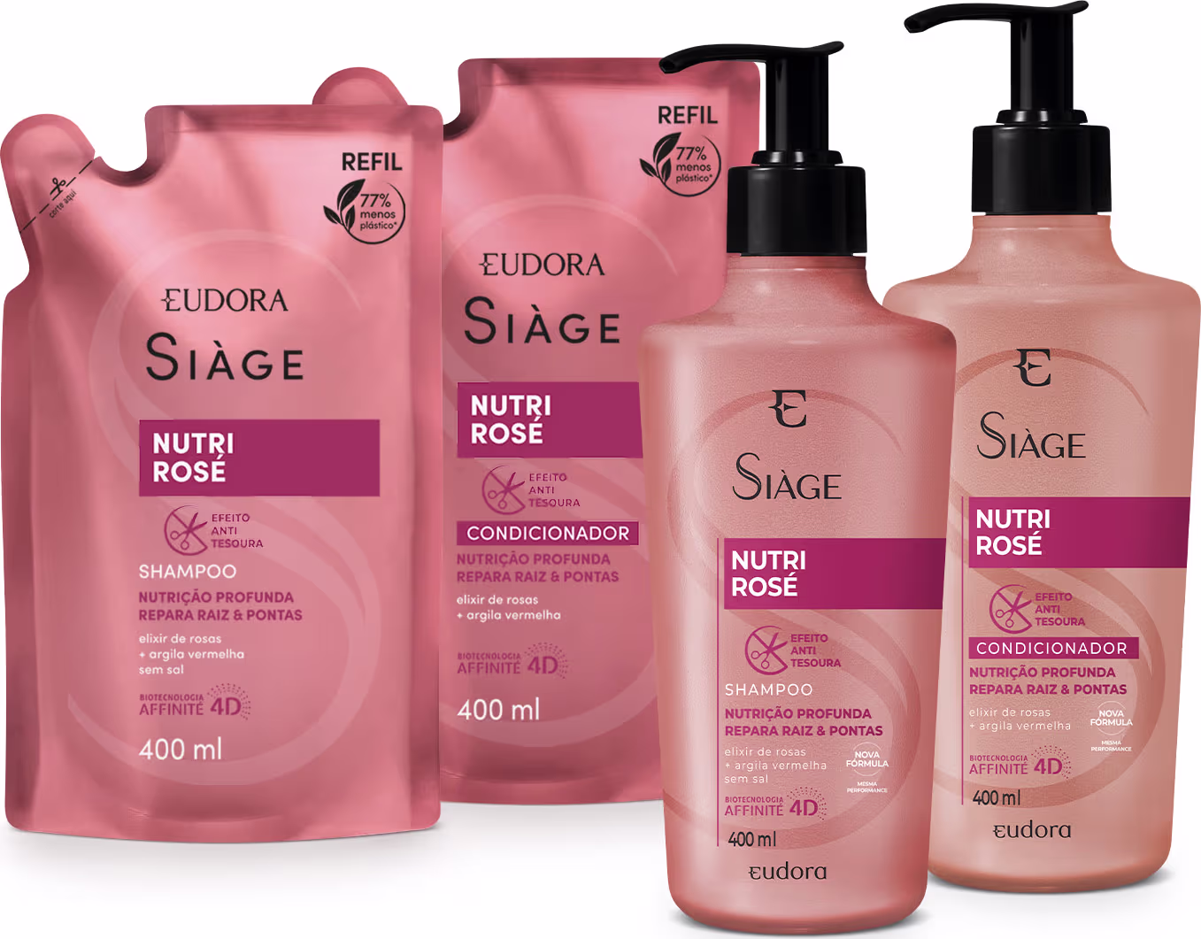 Em quatro itens, o Combo Siàge Nutri Rose entrega cabelos hidratados, saudáveis e livres de pontas duplas. Ver mais ❯