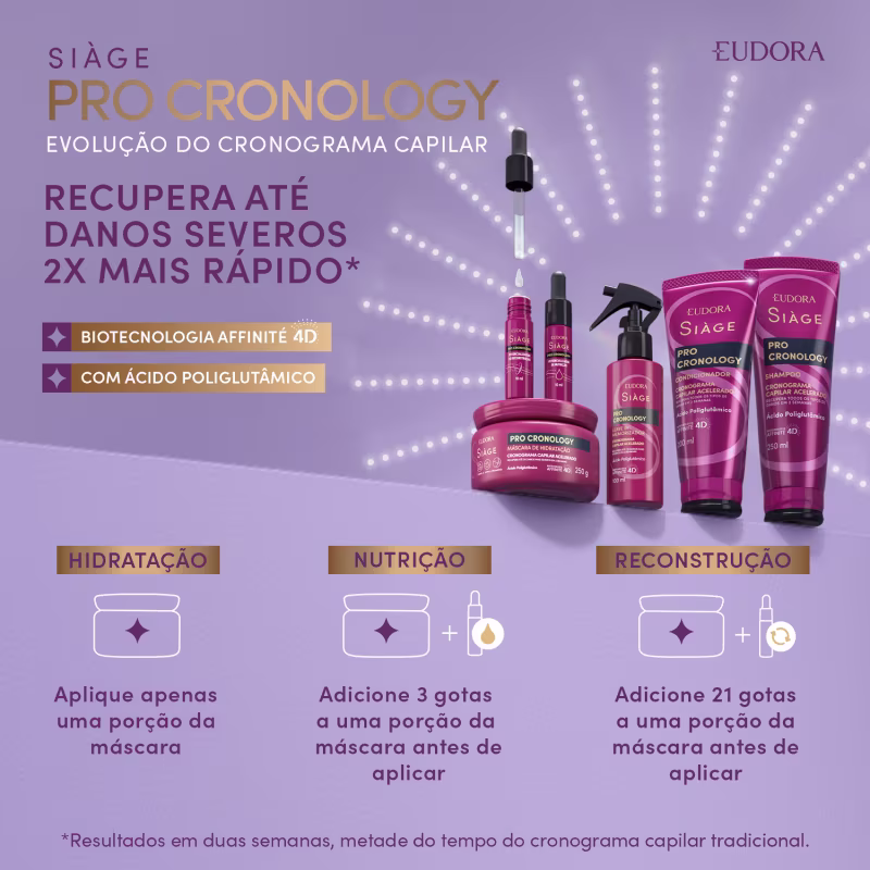 O Combo Siàge Pro Cronology traz higiene e cronograma capilar acelerado para recuperar os seus cabelos. Ver mais ❯