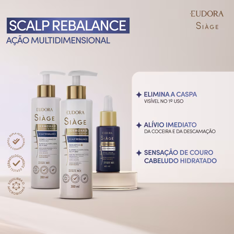 O Sérum Capilar Multidimensional Siàge Dermo Hair Scalp Rebalance age diretamente na raiz do problema, equilibrando o microbioma do couro cabeludo e proporcionando um alívio duradouro.
