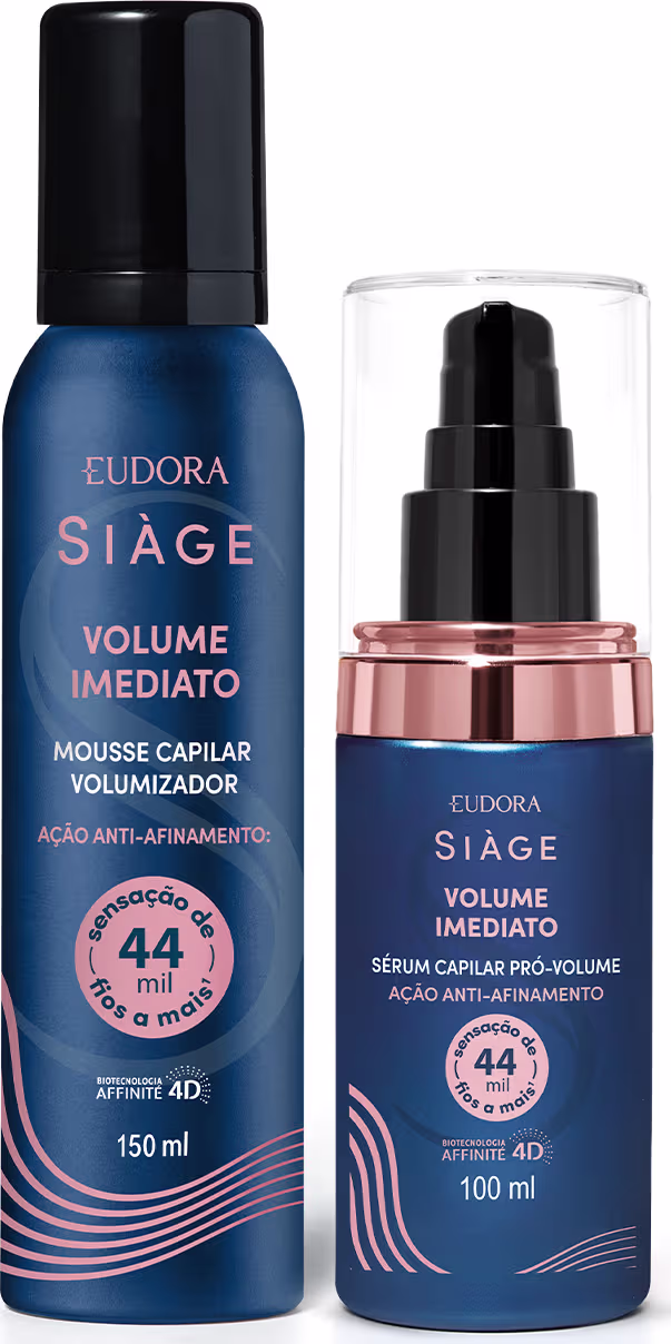 Este combo traz o Sérum Pró-Volume Siàge Volume Imediato e o Mousse Volumizador Siàge Volume Imediato para garantir a finalização perfeita. A vantagem é unir o tratamento anti-afinamento do sérum com a modelagem duradoura do mousse. Juntos, oferecem proteção térmica de até 230°C, reduzem drasticamente o frizz e proporcionam fios encorpados e com volume por muito mais tempo.