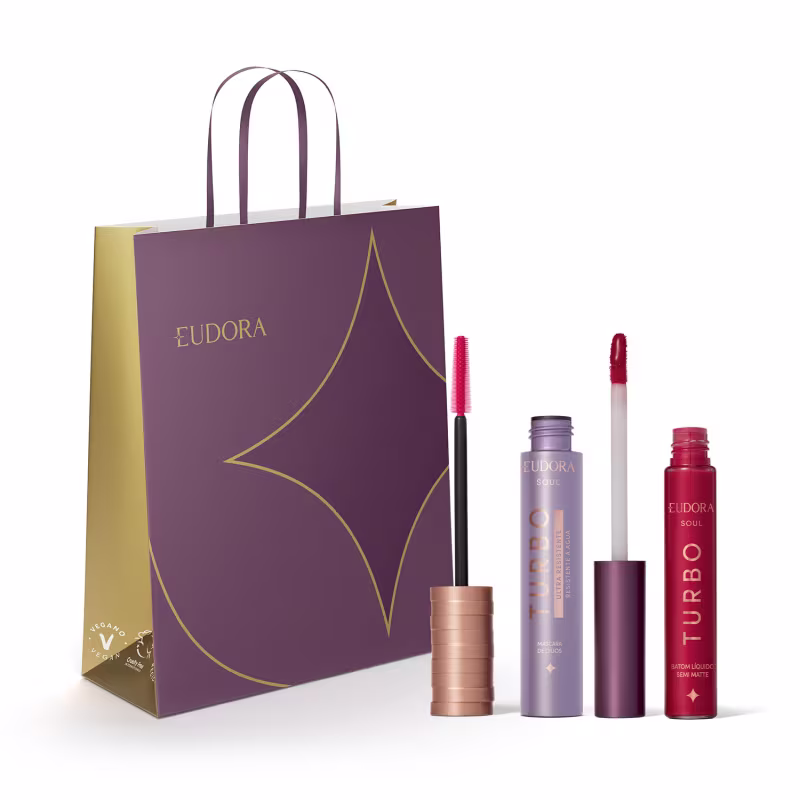 O Combo SOUL Turbo é a combinação ideal para criar looks incríveis com um olhar marcante e lábios vibrantes, com a Máscara Cílios e o Batom Vermelho Turbinado e, ainda, uma Sacola Eudora para presentear.