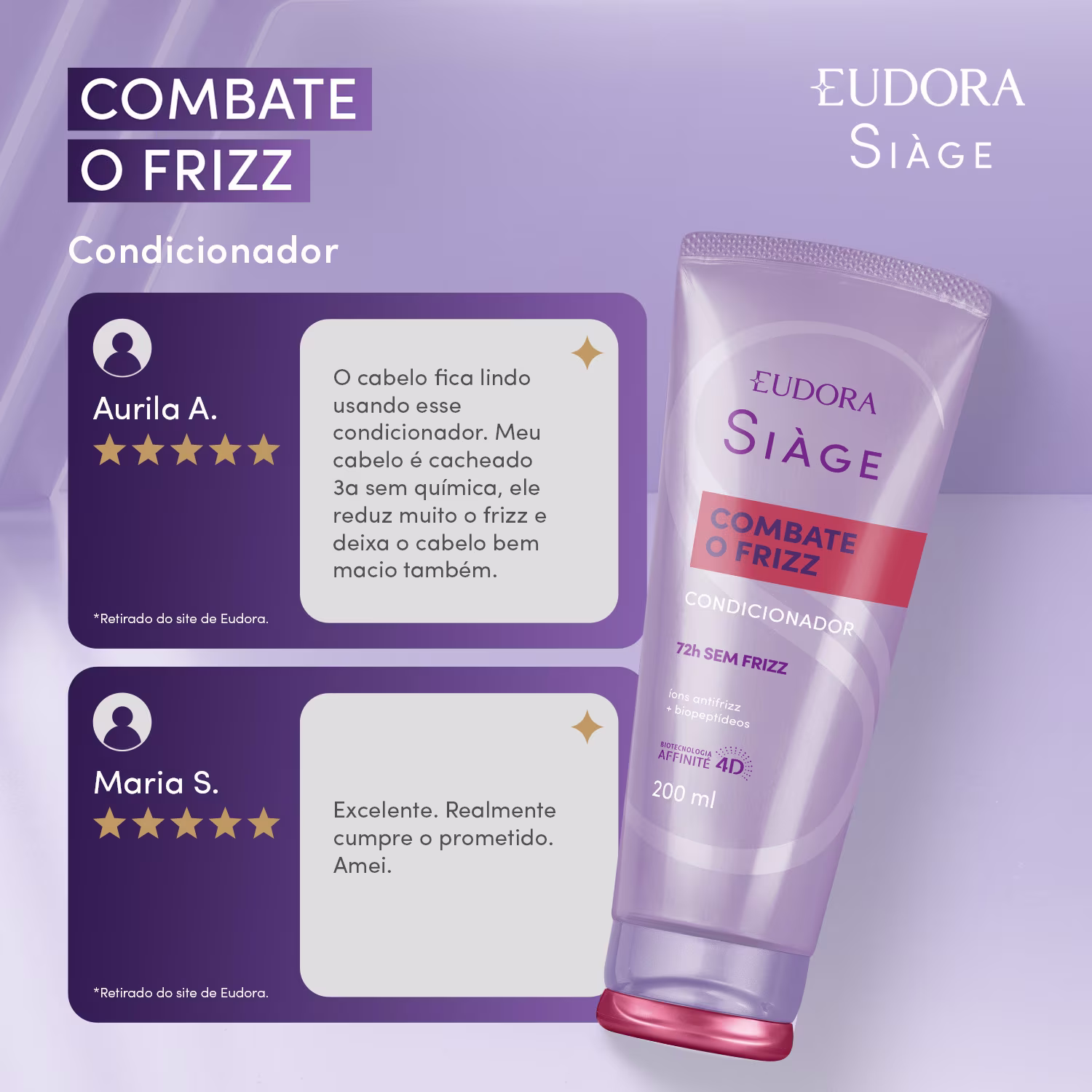 Olha, eu usei o Condicionador Siàge Combate o Frizz por bastante tempo e realmente era o único que deixava meu cabelo bonito, macio e alinhado. Mas percebi um ponto muito negativo: a queda capilar aumentou demais. Fiz até um teste, fiquei 1 mês usando o Bye Bye Frizz da Aussie e a queda diminuiu bastante. Quando voltei para o Siàge, a queda ficou violenta novamente. Uma pena, porque o efeito visual é ótimo, mas o impacto na saúde do cabelo me deixou bem preocupada.