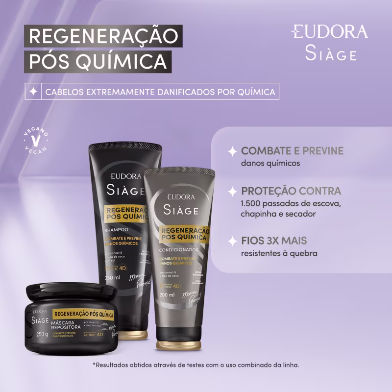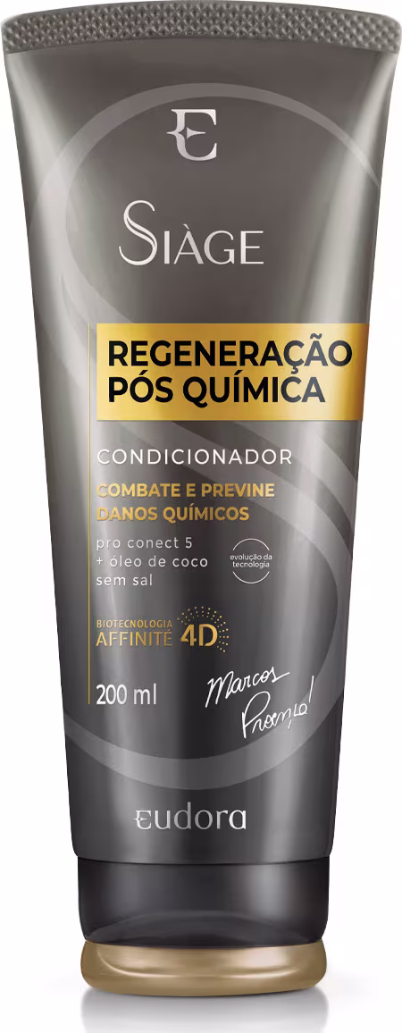 Siàge Regeneração Pós Química, assinada pelo expert Marcos Proença, traz o complexo tecnológico Pro Conect 5 + Óleo de coco que promove o religamento das pontes capilares dos fios ressecados e quebrados por agressões químicas.