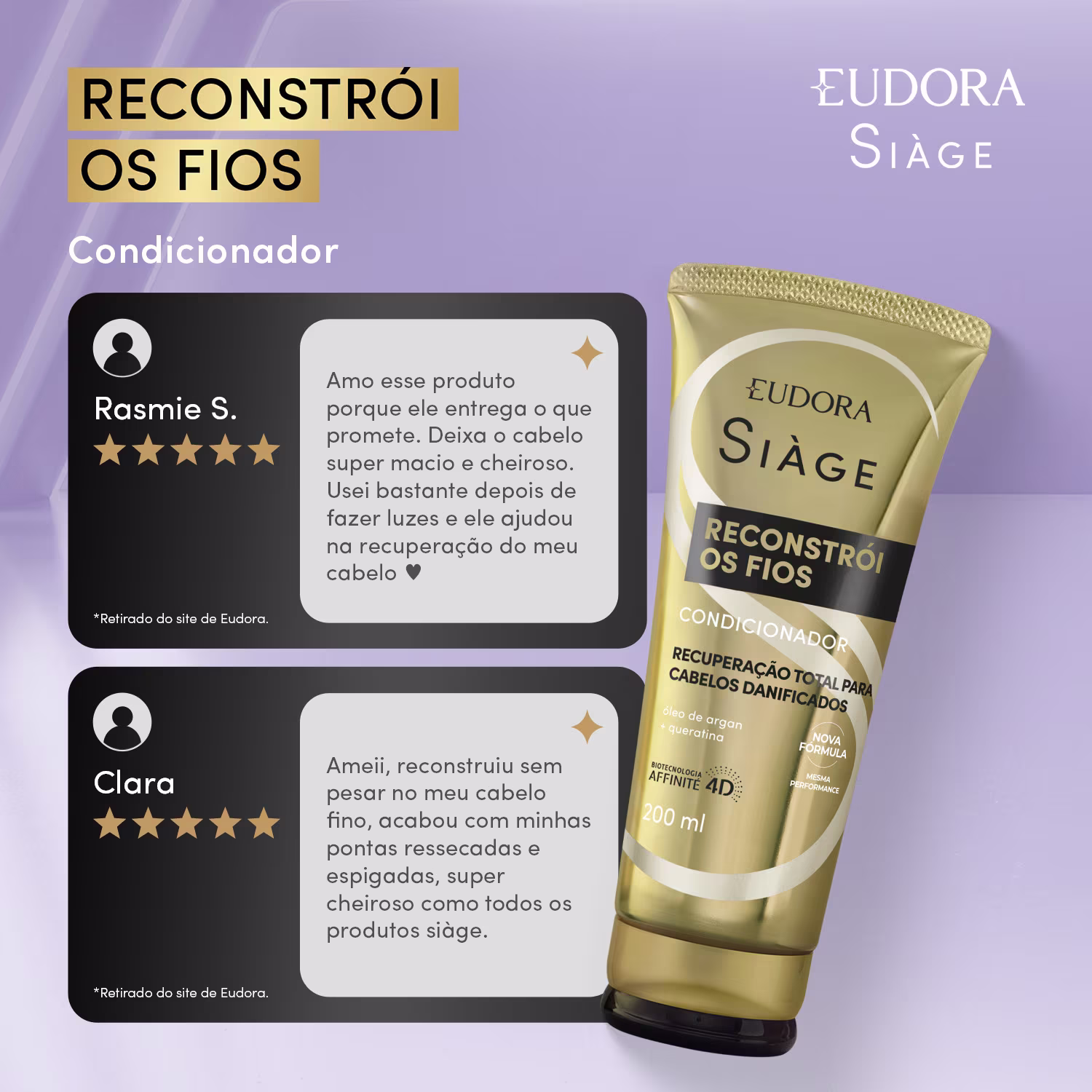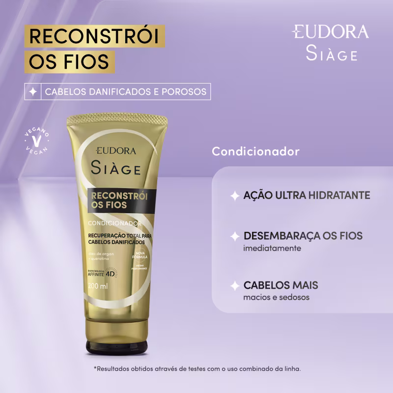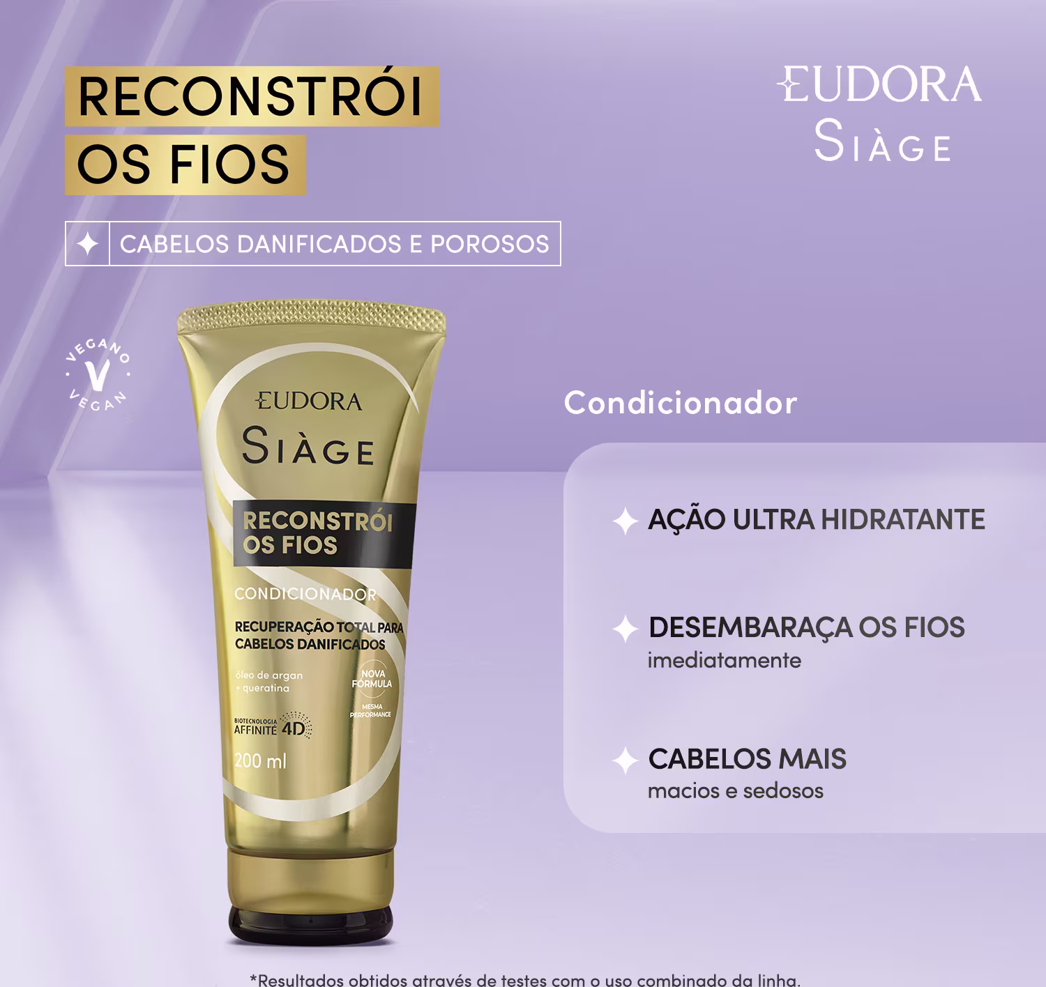 Eudora Siàge uniu a força da natureza ao poder da ciência e criou a exclusiva biotecnologia Affinité 4D. Com inteligência detectora de danos, trata os fios até a camada mais profunda, mesmo após o enxágue. A linha Siàge Reconstrói os Fios conta com uma gama completa de produtos que entregam 6x mais força, combate as pontas duplas e quebradas e recupera 1 ano de danos em apenas duas semanas de tratamento.