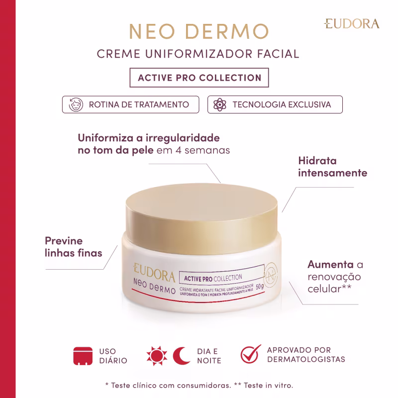 Desenvolvido com a exclusiva Tecnologia Uniform Skin + Melavoid™, o Creme Hidratante Facial Uniformizador Neo Dermo oferece um tratamento completo para uma pele visivelmente mais uniforme e hidratada em apenas 4 semanas*.