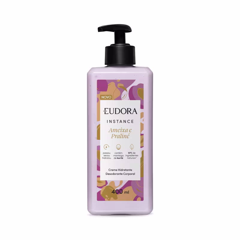 Eudora Instance traz para a sua rotina de cuidados básicos o Creme Hidratante Desodorante Corporal Instance Ameixa e Praliné, unindo hidratação com uma fragrância envolvente.