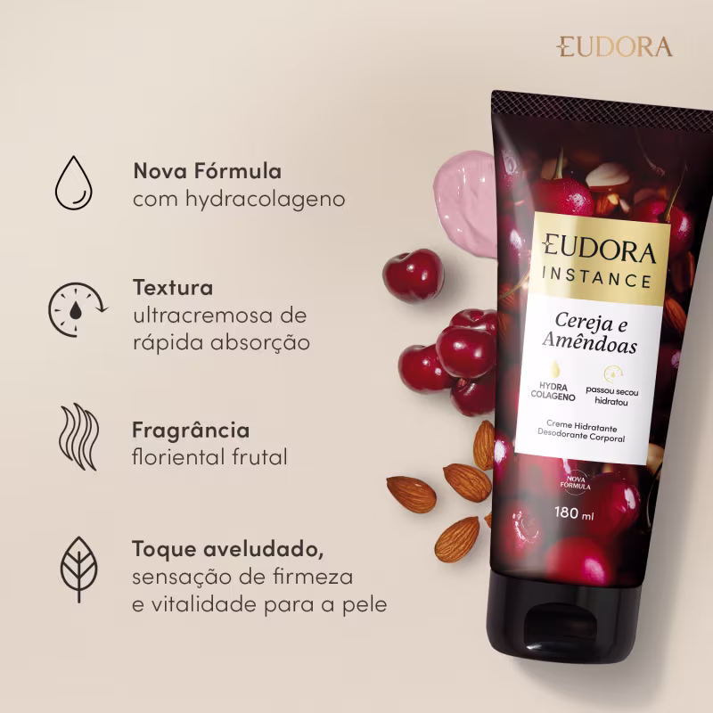 O Creme Hidratante Desodorante Corporal Instance Cereja e Amêndoas possui textura cremosa e perfumação intensa, com uma fragrância floriental adocicada e envolvente.