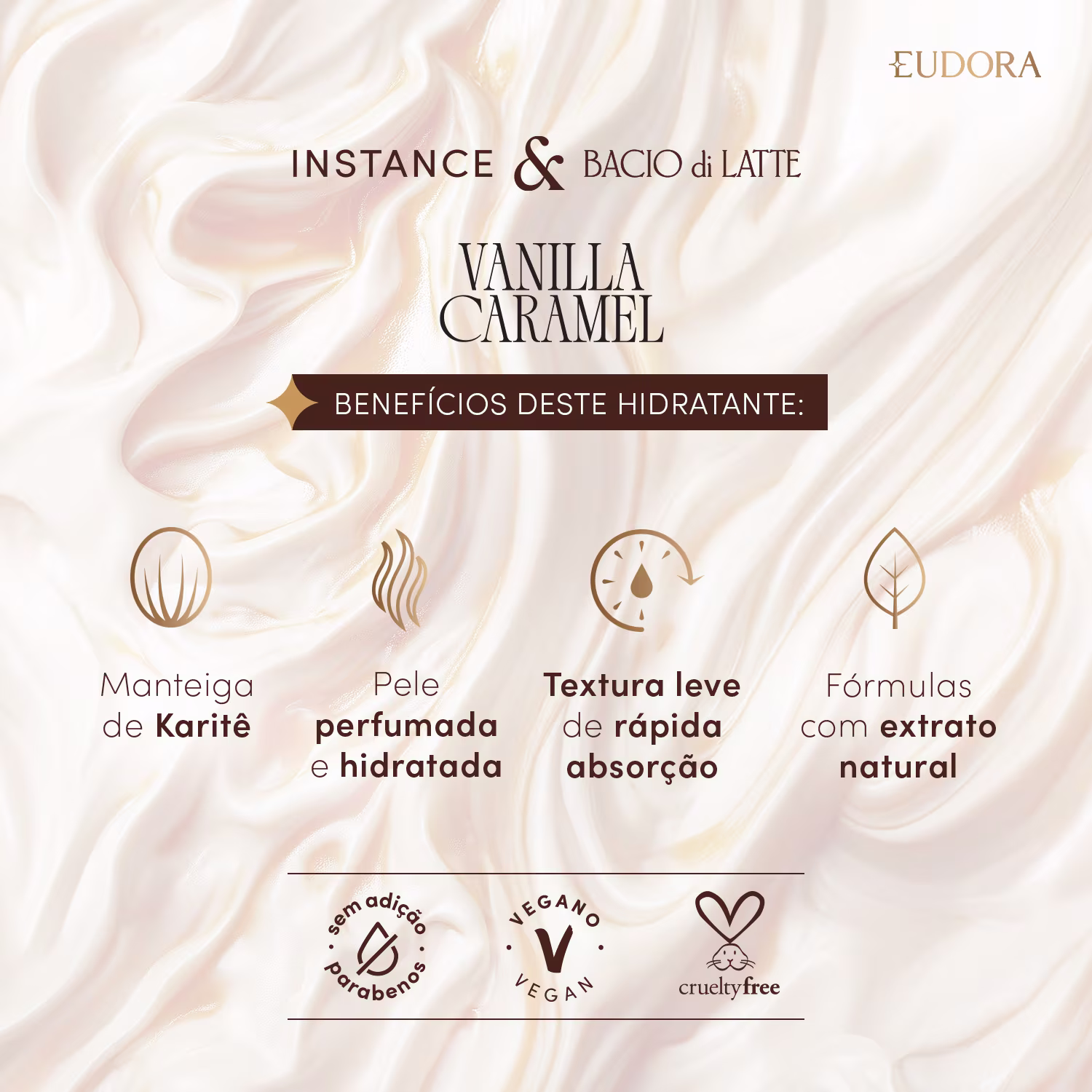 Sinta a pele envolta em uma experiência irresistível e sofisticada com o Creme Hidratante Desodorante Corporal Instance Vanilla Caramel.