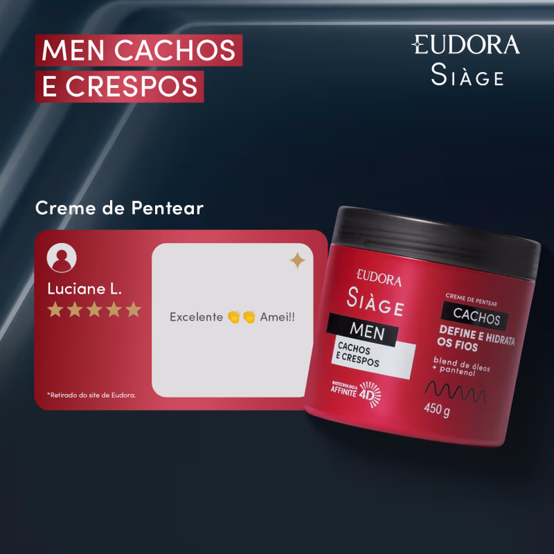 “Cabelos com curvatura tendem a ser mais ressecados. Este Creme para Pentear, com Blend de Óleos e Pantenol, penetra profundamente na fibra capilar, garantindo definição duradoura e frizz controlado.” Especialista em cabelo de Eudora