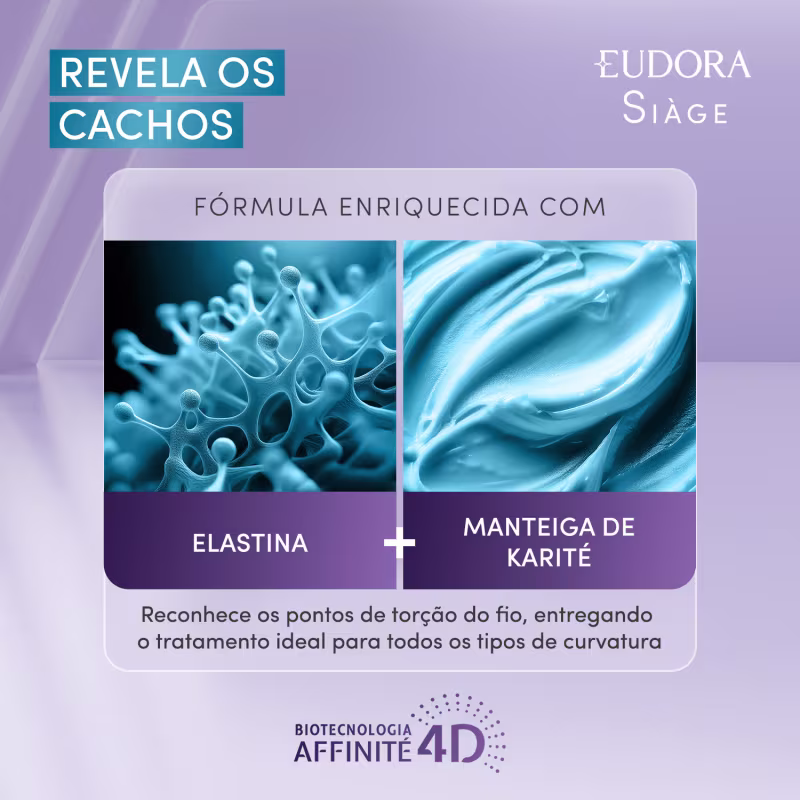 Fórmulas com Elastina, combinada à Manteiga de Karité, que garantem alta definição, força, elasticidade e 3X menos frizz.