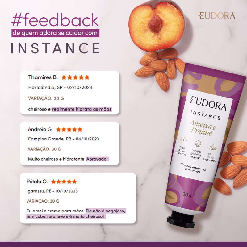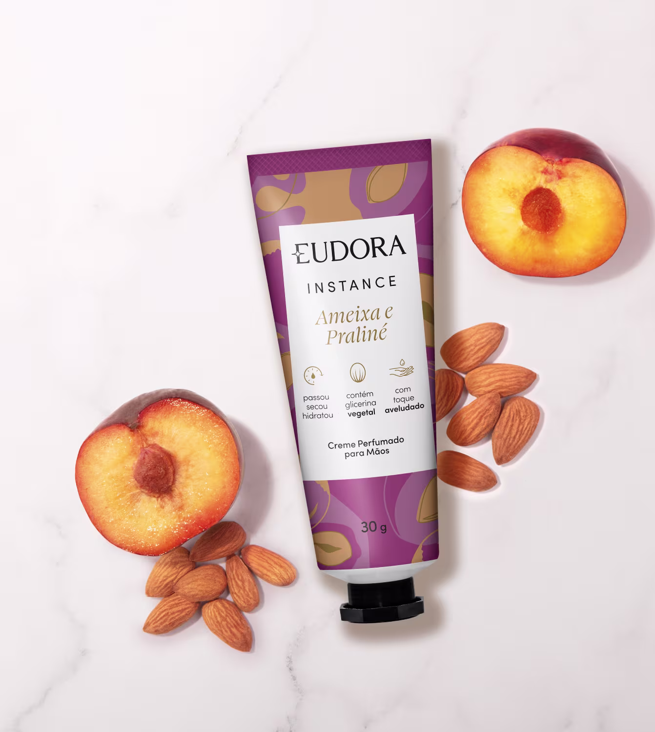Eudora Instance sabe: você adora se cuidar e seu tempo é precioso. Instance é cuidado no seu tempo. Por isso, apresenta Ameixa e Praliné, uma linha que une a suculência da Ameixa Roxa com a indulgência do Praliné, combinação para a rotina de cuidados da mulher de Eudora!