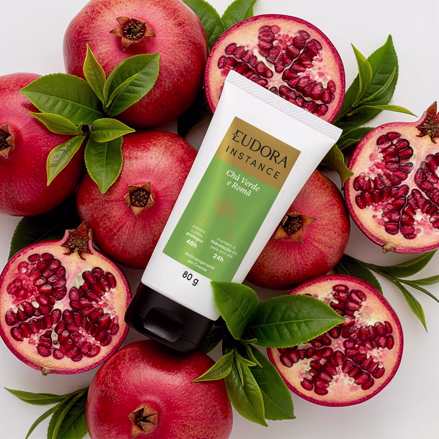 O Desodorante Antitranspirante Creme Chá Verde e Romã Eudora Instance é o seu aliado para axilas protegidas por até 48 horas! Com ele, você se sente confiante, poderosa e envolvida pelo frescor vibrante do Chá Verde e Romã.