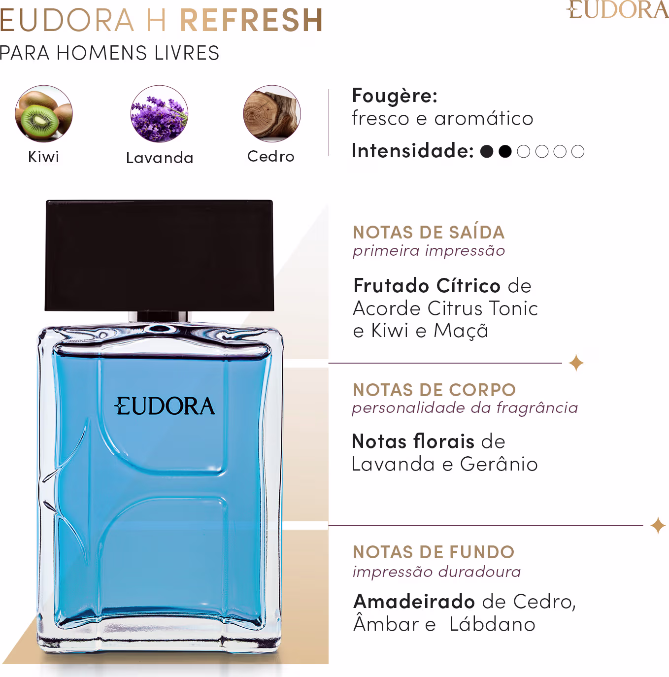 Sinta o frescor do novo em todo momento com Eudora H Refresh, nova fragrância masculina fougère da linha. Ver mais ❯