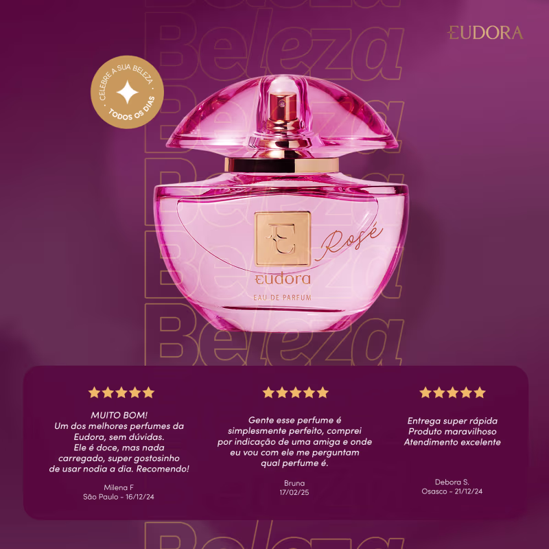 Eudora Rosé Eau de Parfum traz o impacto borbulhante do espumante para criar um Chypre Frutal sofisticado e intenso, com boa fixação.