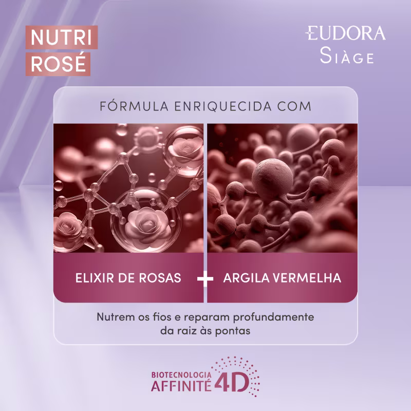 A linha Siàge Nutri Rose nutre profundamente a fibra capilar, restaurando os cabelos danificados e trazendo de volta à vida a beleza dos seus fios. Seus ativos poderosos combinados à exclusiva Biotecnologia Affinité 4D promovem uma recuperação capilar instantânea, que você sente a diferença desde a primeira aplicação. Seus cabelos ficam saudáveis, equilibrados e sem pontas duplas, sem necessidade de recorrer ao corte.