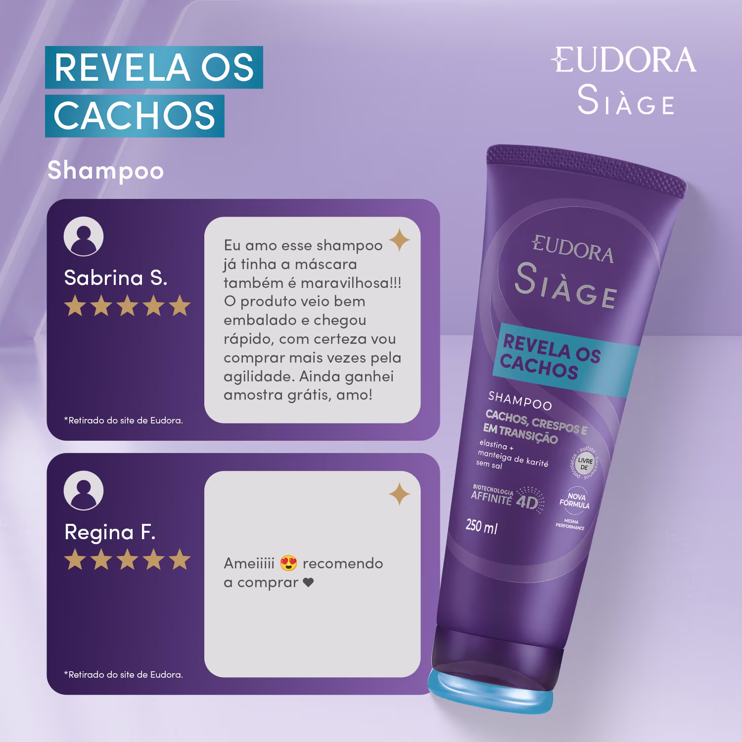 Shampoo Eudora Siàge Revela os Cachos garante fios limpos, cachos bem definidos e com menos frizz. Ver mais ❯