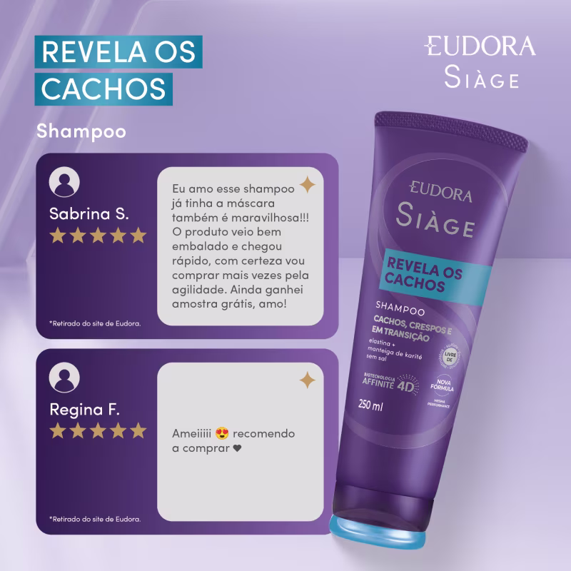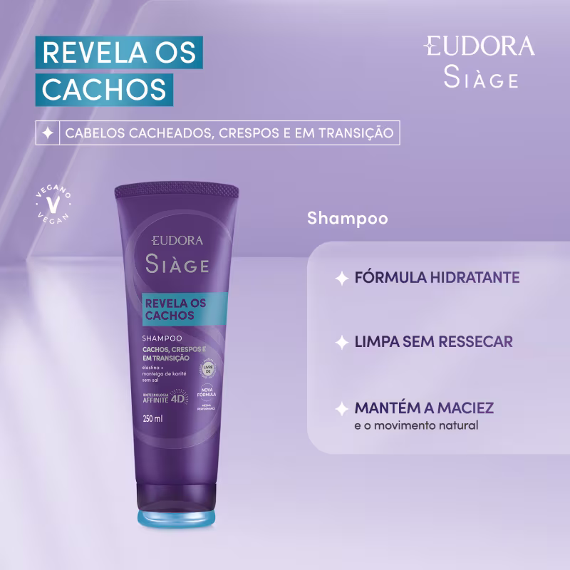 O Shampoo Eudora Siàge Revela os Cachos limpa profundamente os fios, entregando cachos definidos, macios e com aspecto natural. Sua fórmula com Elastina e Manteiga de Karité possui tecnologia inteligente que reconhece os pontos de torção do fio, entregando o tratamento ideal para todos os tipos de curvatura: ondulados, cacheados, crespos e até mesmo em transição.