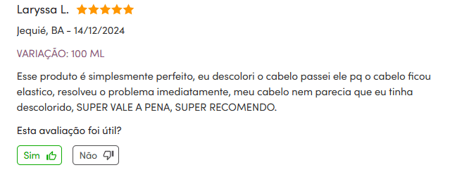Veja o que a consumidora Lully falou sobre a compra do Combo Siàge Hair-Plastia: