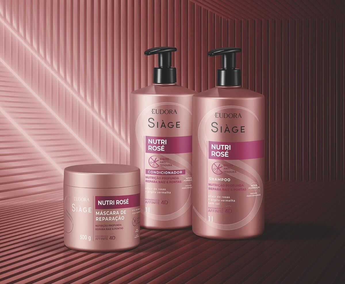Além das versões de shampoo e condicionador de 1 litro e 400ml, também temos as máscaras capilares 500g com o dobro de uma máscara capilar comum. Elas estão disponíveis nas linhas Siàge Nutri Rosé e Siàge Regeneração Pós Química.