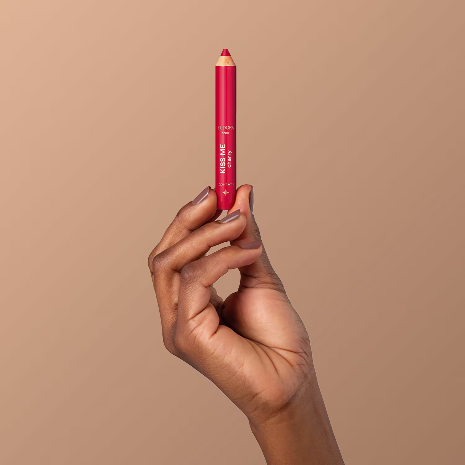 O Lápis Multifuncional Kiss Me Cherry possui fórmula com alta pigmentação e textura macia, ideal para ser utilizado nos olhos, para delinear ou esfumar, nas bochechas para deixa-las coradas e também para contornar e colorir os lábios.