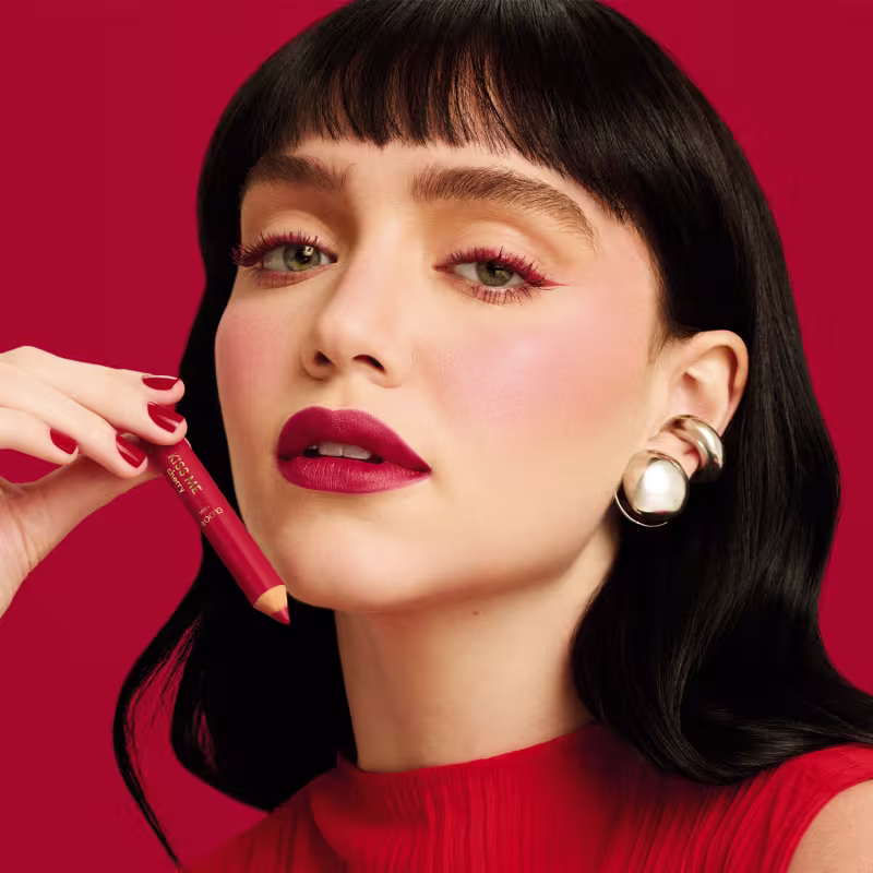 Lápis Multifuncional Kiss Me Cherry com cor vibrante, textura macia e alta pigmentação para lábios, olhos e bochechas. Ver mais ❯