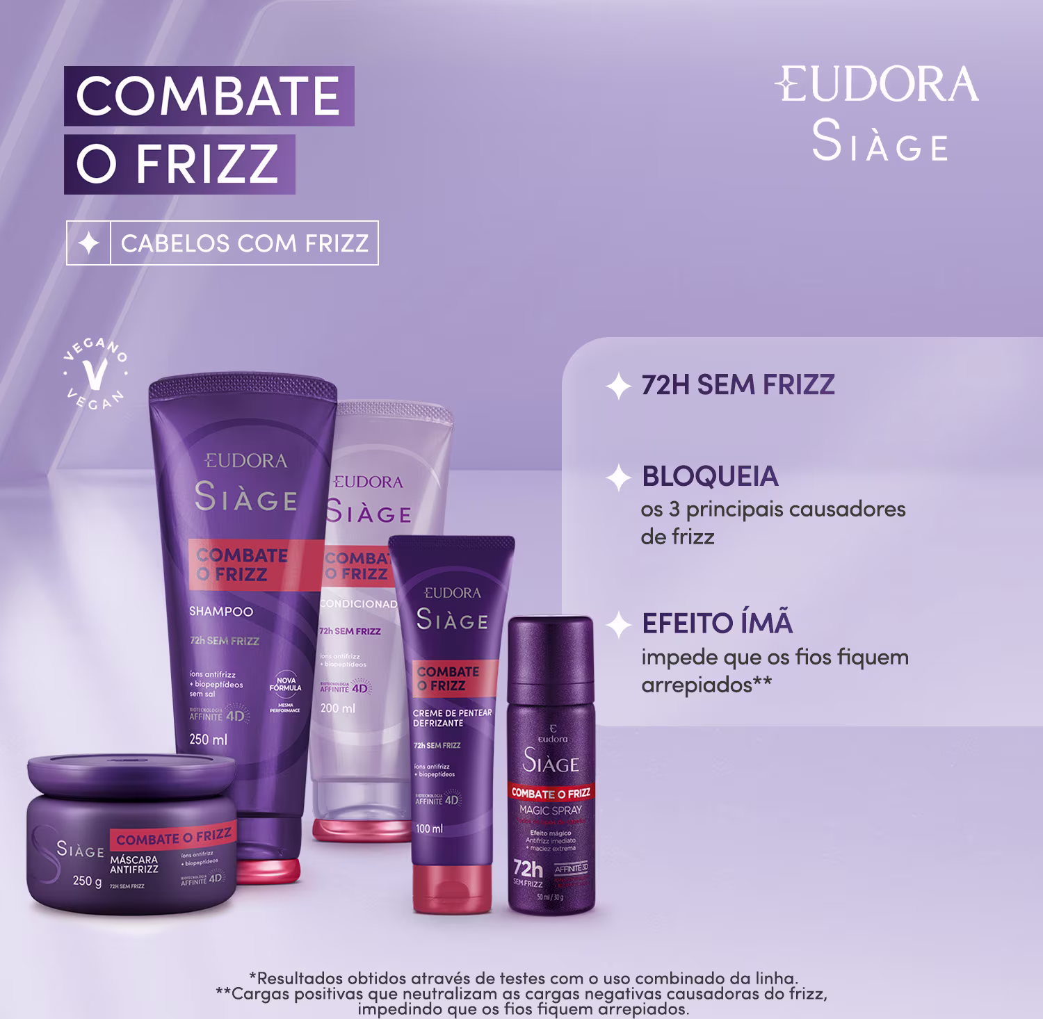 Sabe aquele produto mágico que salva seus cabelos quando você mais precisa? É o Magic Spray Capilar Siàge Combate o Frizz, um spray capilar que você vai ter sempre consigo para todos os momentos. Imediatamente e com uma única aplicação, ele vai reduzir o frizz e proporcionar uma maciez sem igual.