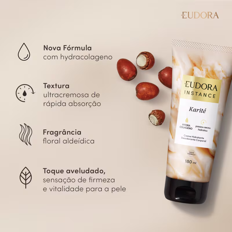 Agora com Hydracolageno, colágeno vegetal, que junto com a fórmula exclusiva de Eudora Instance, proporciona sensação de firmeza, vitalidade e hidratação profunda por até 48 horas*.