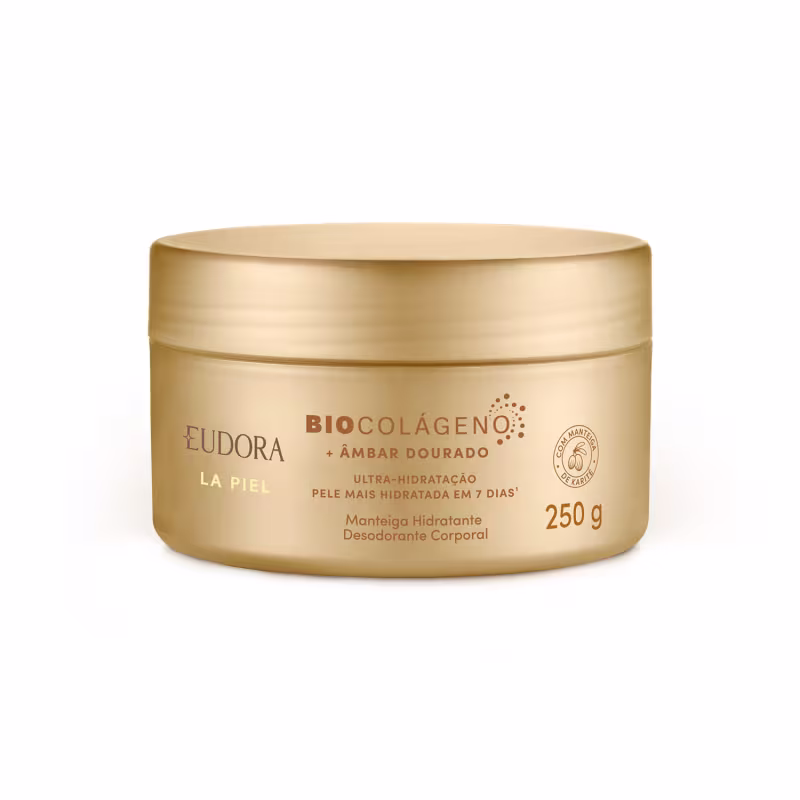 A Manteiga Hidratante Desodorante Corporal La Piel Âmbar Dourado tem 10% de Manteiga de Karité, ingrediente altamente hidratante, e a combinação do Biocolágeno, Niacinamida e Pantenol, aumenta a produção de colágeno natural, proporcionando firmeza em 14 dias.