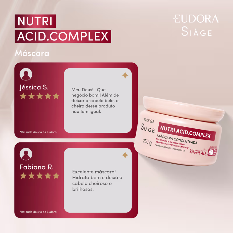 “Se o seu cabelo está poroso, com muito frizz, com volume excessivo, ele precisa de NUTRIÇÃO. A nutrição que vai repor os lipídios, que vão deixar as cutículas alinhadas. Esta máscara faz a reposição nutri lipídica instantânea em apenas 20 segundos" Expert em cabelos de Eudora
