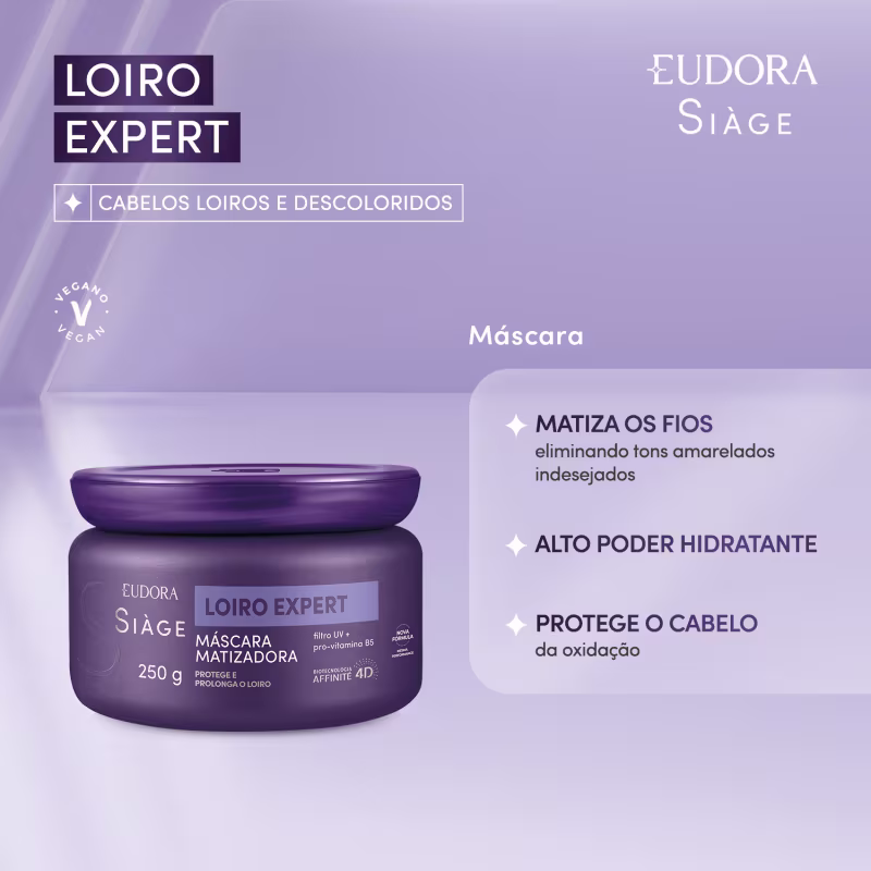 A Máscara Capilar Matizadora Siàge Loiro Expert hidrata intensamente, matiza e protege os fios da oxidação. Ver mais ❯