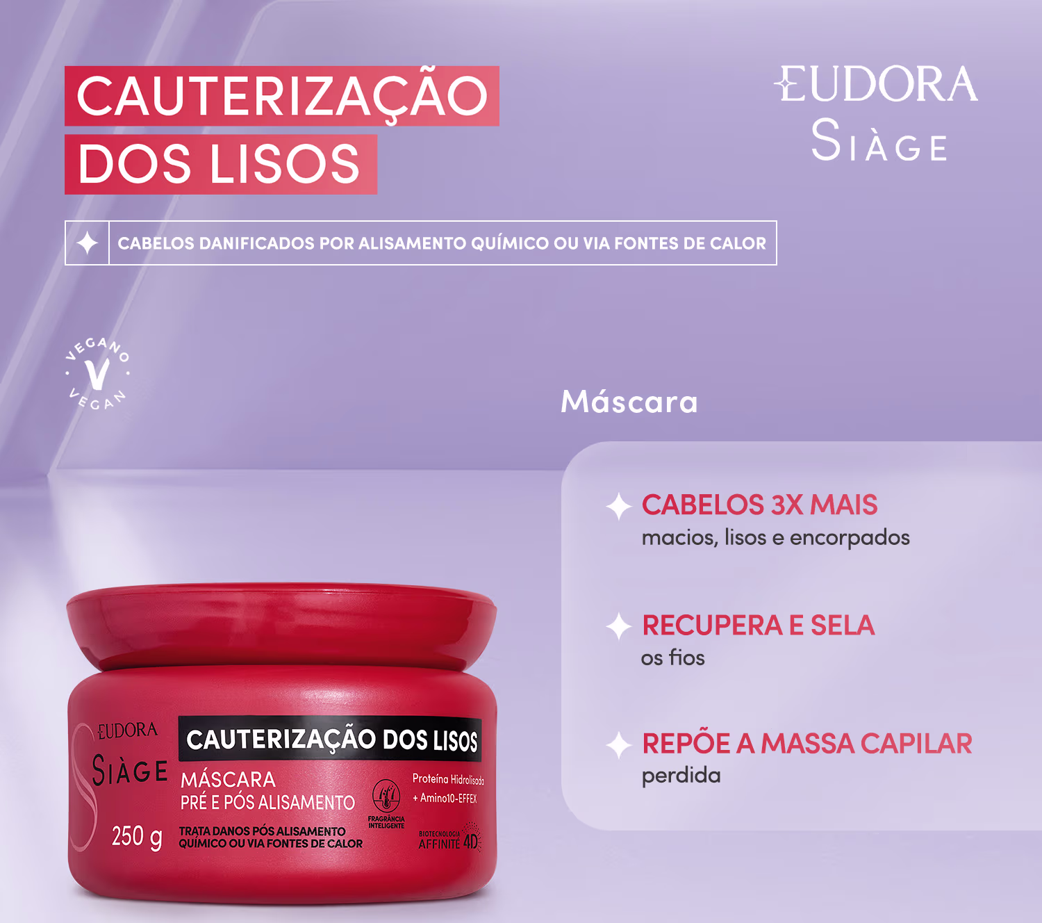 A Máscara Capilar Siàge Cauterização dos Lisos deixa os fios mais encorpados, 3x mais macios e resistentes. Ver mais ❯