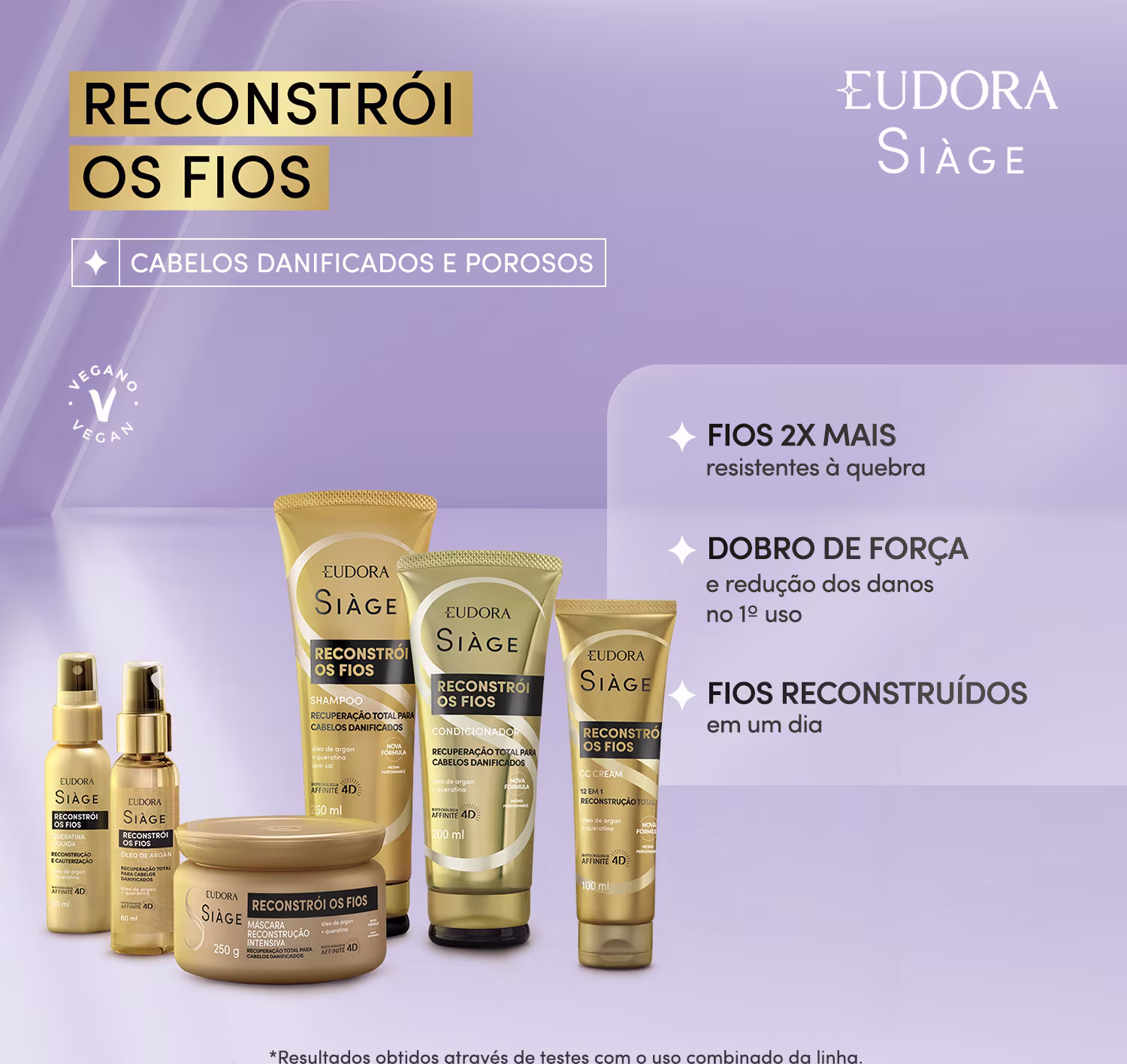 Eudora Siàge uniu a força da natureza ao poder da ciência e criou a exclusiva biotecnologia Affinité 4D. Com inteligência detectora de danos, trata os fios até a camada mais profunda, mesmo após o enxágue. A linha Siàge Reconstrói os Fios conta com uma gama completa de produtos que entregam 6x mais força, combate as pontas duplas e quebradas e recupera 1 ano de danos em apenas duas semanas de tratamento.